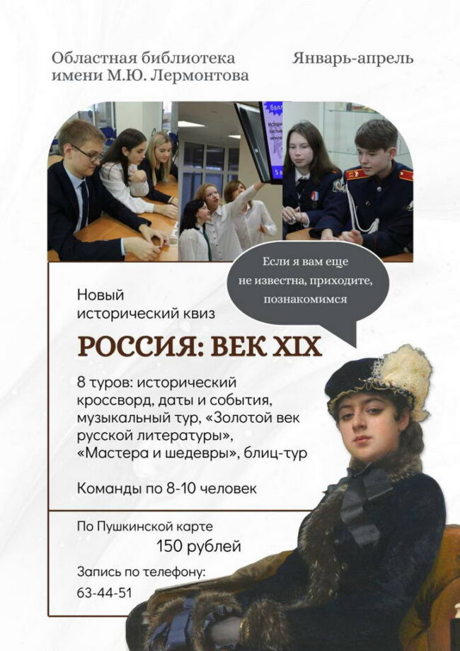 Студенты Пензенского казачьего института технологий. приняли участие в историческом квизе «Россия: век XIX», организованном областной библиотекой имени М. Ю. Лермонтова. Турнир проходил в мультимедийном зале учреждения 21 ноября и включал восемь тематических раундов различной сложности: исторический кроссворд, вопросы о датах и событиях, музыкальный тур, задания по «Золотому веку русской литературы», творчеству художников-передвижников, композиторов «Могучей кучки», эпохальным сражениям, выдающимся полководцам, а также открытиям российских ученых-путешественников.
